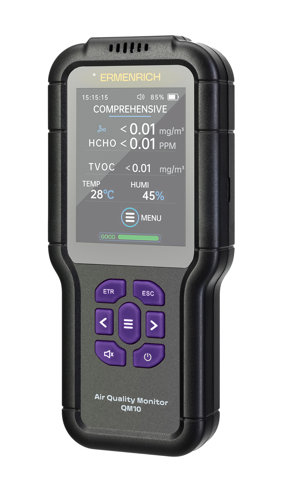Az Ermenrich QM10 levegőminőség-érzékelő kézi műszer a beltéri levegő összetételének elemzésére, a káros anyagok emelkedett szintjének kimutatására és a mikroklíma monitorozására. Használható otthoni és kereskedelmi környezetben – irodákban, szállodákban, iskolákban, óvodákban, kávézókban, üzletekben stb., de ipari célokra nem – a TVOC (illékony szerves vegyületek) méréstartománya 0,0–10,0 mg/m3, ami nem elegendő az ipari környezetben gyakran előforduló nagyobb koncentrációk észleléséhez.