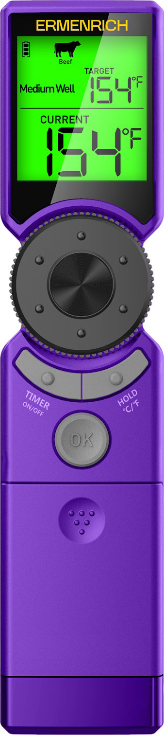 Bemutatjuk új okos konyhai segítőjét: Ermenrich BBQ GT10. Legyen szó lédús csirkéről, sovány pulykáról, bifsztekről vagy zamatos bárányról, a segítségével bármilyen húst úgy készíthet el, mint amilyenre megálmodta. A hőmérő a tökéletes eredmények érdekében a legnépszerűbb hústípusokra vonatkozó, előre beállított programok segítségével automatikusan javaslatot tesz az ideális célhőmérsékletre és elkészítési időre. Minden alkalommal magabiztosan és ízletesen készítheti el kedvenc sült, grill vagy barbecue fogását.