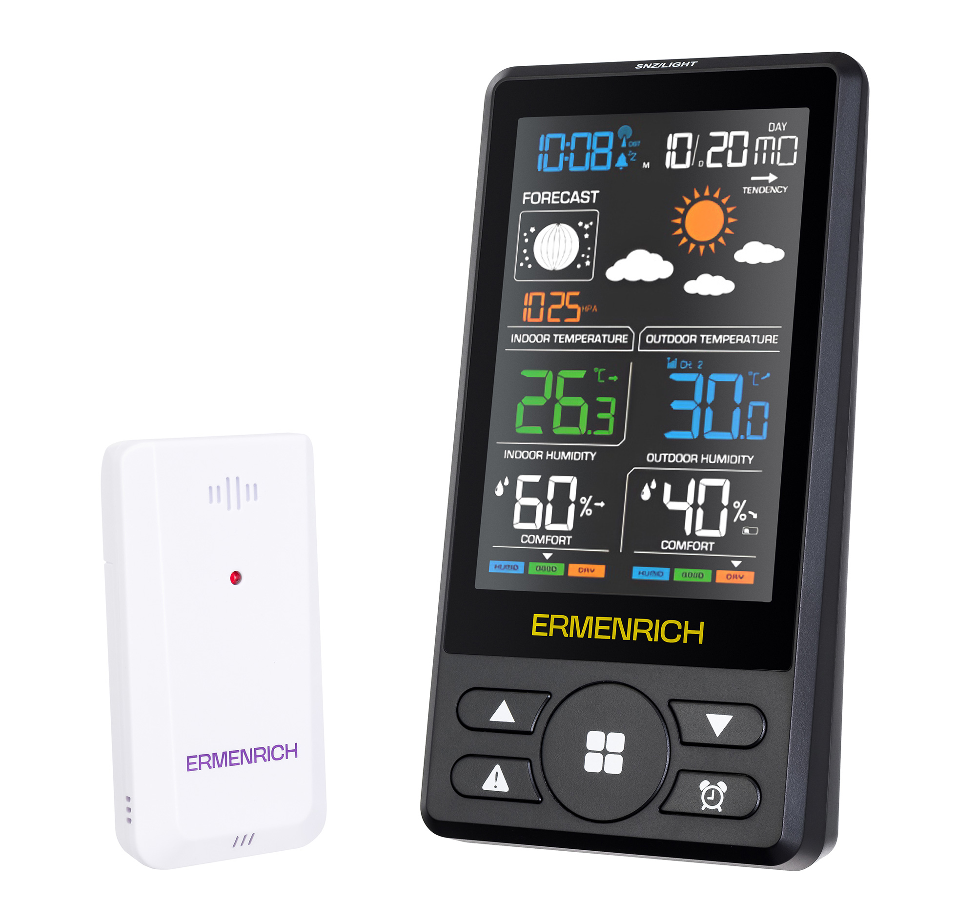 Az Ermenrich Report WR50 otthoni időjárás-állomás sokféle funkcióval könnyíti meg a mindennapi életet. Segít nyomon követni az időjárás változásait és szabályozni a lakás mikroklímáját. A nagy méretű színes képernyőn az összes fontos légköri információ megjelenik: beltéri és kültéri hőmérséklet és páratartalom, légköri nyomás, időjárás-előrejelzés, és komfortszint. Az eszköz digitális óraként és naptárként is jó szolgálatot tesz (ezeket az információkat a kijelző alsó részében jeleníti meg). Éjjeliszekrényeken elhelyezve ébresztőóraként is használható. A csillagászatot és a néphagyományokat kedvelők bizonyára örülni fognak neki, hogy a képernyőn a Hold fázisai is láthatók.