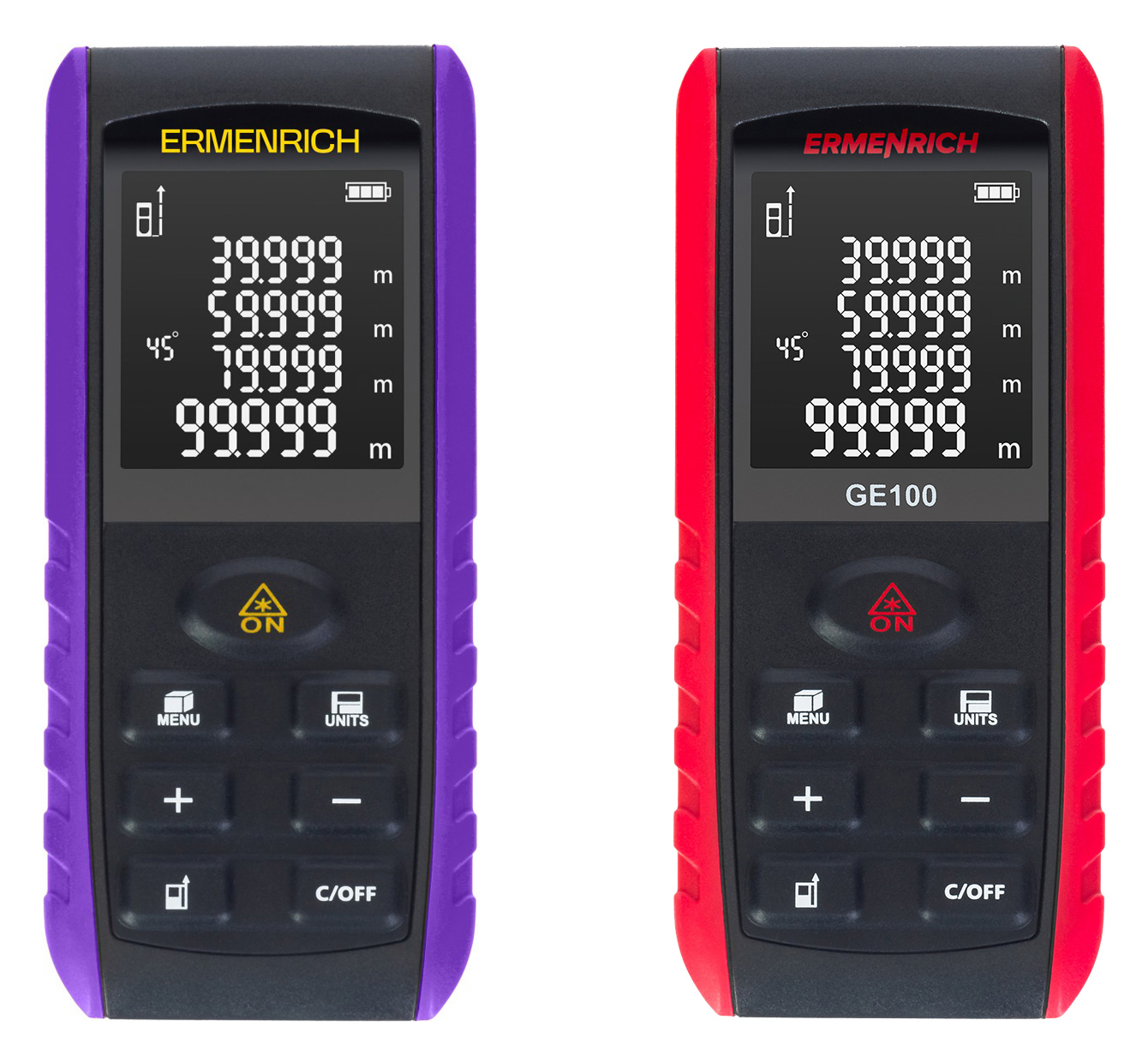 Az Ermenrich Reel PRO GE100 lézeres mérő egy kompakt műszer, különböző építőipari, javítási és mindennapi feladatokban való használatra. Segítségével 2 milliméteres pontossággal meg lehet határozni két pont közötti távolságot, továbbá kiszámítható vele a terület és a térfogat, illetve meg lehet mérni egyes objektumok szögét. A mérőműszer emellett Pitagorasz-tétel funkcióval is rendelkezik – a távolságokat köztes mérések segítségével is ki tudja számítani. Ez akkor lehet praktikus, ha a mérőműszert nem lehet a kívánt ponton elhelyezni, vagy ha a sugár útjában akadály van.